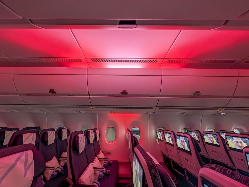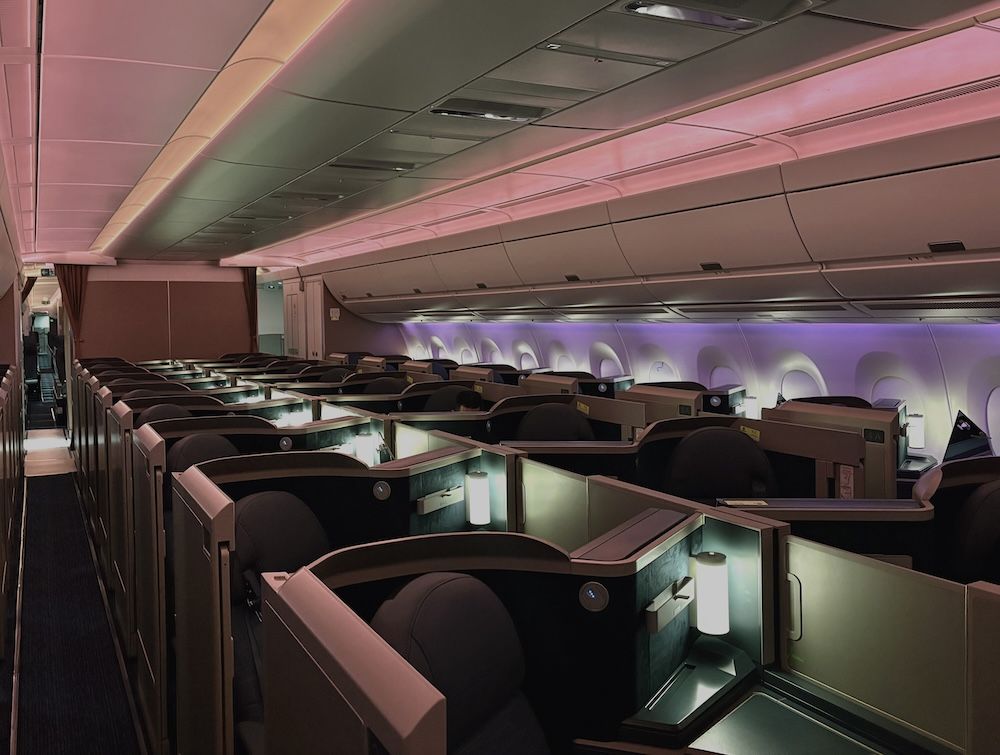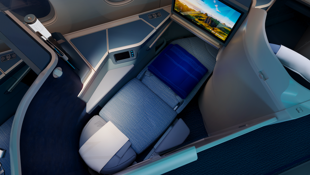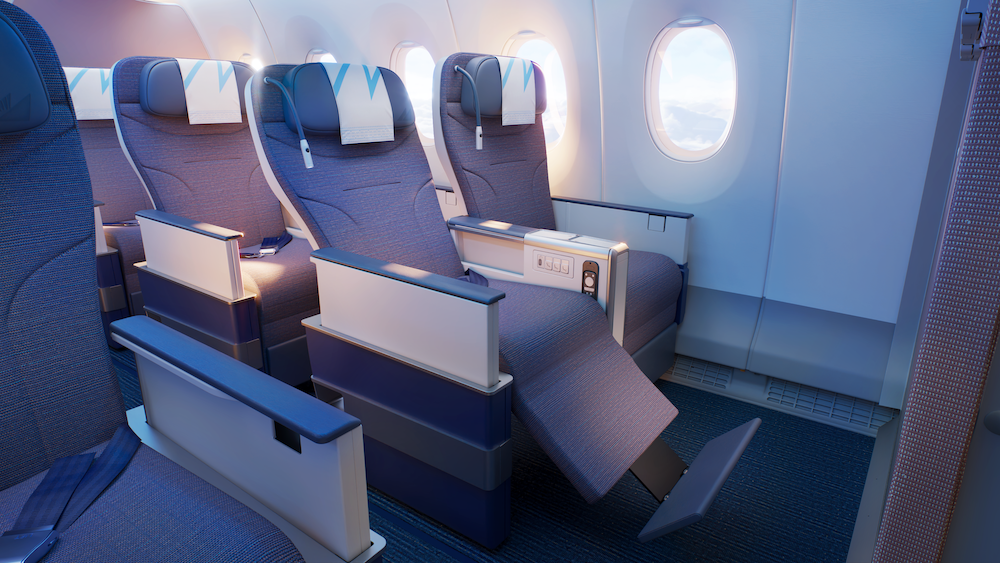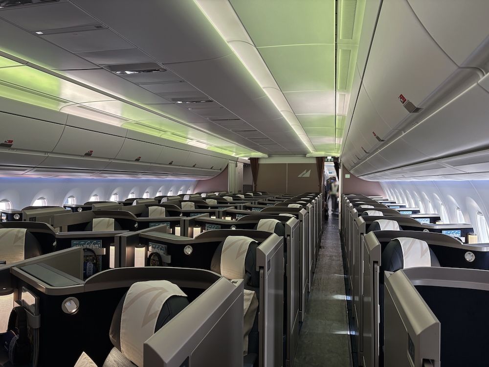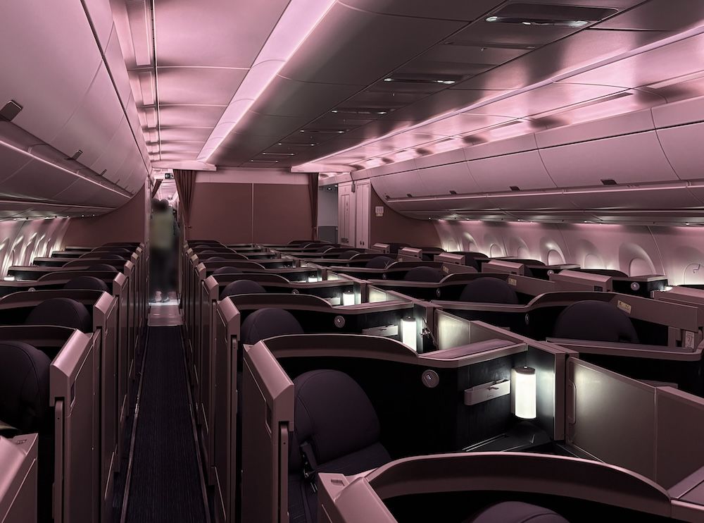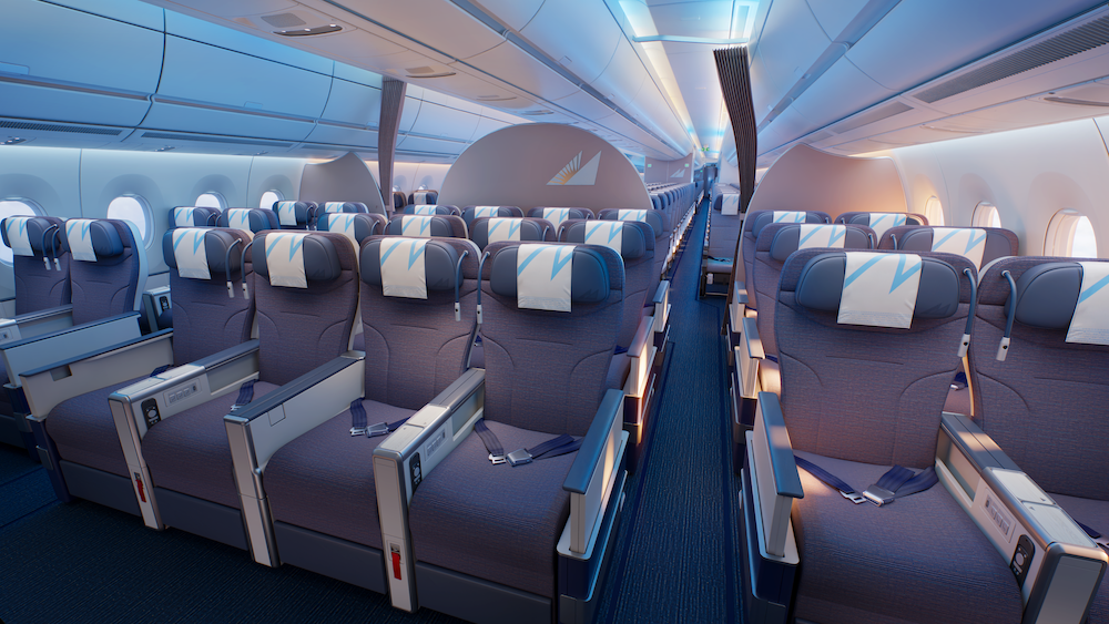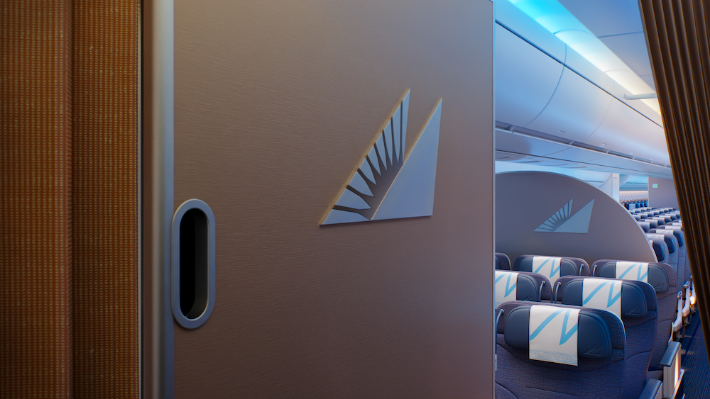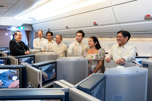 The ‘Mabuhay Studios’ business-class cabin has suite walls for privacy. All images: PAL / LIFT Aero DesignThe seat trim and finish in business class blends slate blue with champagne gold, with pale wood-look inlays on the meal tablesThe business-class suites offer privacy from the aisleThe ‘Mabuhay Studios’ business-class cabin features 42 full-flat suites with sliding doors, arranged in a 1-2-1 layout for direct aisle accessThe ‘Mabuhay Studios’ business-class seat with the full-flat bed deployedThe National Flag lighting scheme for arrivals in ManilaThe Spa lighting scheme for ‘zen-in-the-sky’ relaxationThe Candlelight Dining lighting scene for long-haul flightsThe Ocean lighting scene, as well as the new carpet design, has a theme of the colours of the tropical seas of the PhilippinesThe green Sustainability lighting programmeThe Rose Gold lighting scheme for regional flightsThe 24-seat premium-economy cabin features recliner seats, each equipped with a legrest and footrestThe PAL A350-1000 premium-economy seats have mini cocktail tables, multiple stowage spaces, in-seat power outlets, as well as both USB-A and USB-C charging portsThe premium economy seats with the legrest and footrest deployedThe airline’s logo is displayed in brushed silver on the brand panelsMore PAL branding in premium economyThe vibrant Valentine’s Day lighting scheme in economy classThe 316 economy-class seats have seatback IFE displaysThe PAL team showing off their new A35-1000 cabin designs. Photo: MalacañangPAL’s new flagship aircraft sports the airline’s ‘Sunrise’ livery, accented with a ‘85 Years’ decal to commemorate its 85th year of operations. Photo: Malacañang
