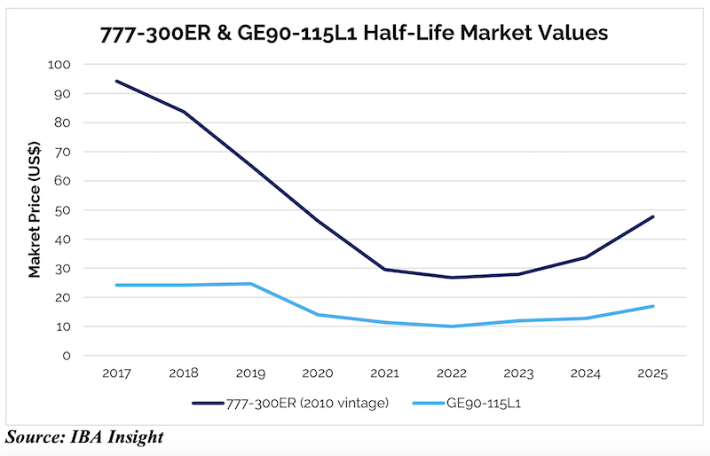 Half-life market values for the Boeing 777-300ER have jumped 78% in 2025, to about US$ 47.6 million, up from the lows of circa US$ 26.7m recorded in 2022 for a 2010 vintage.