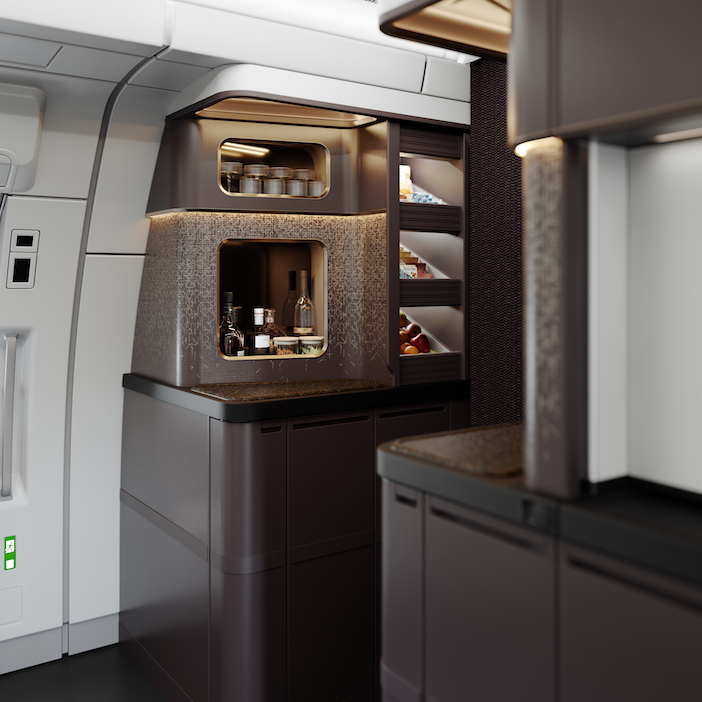 Another key element of the Omnia concept is the dual-aspect bar area. The two bar zones, one positioned each side of the aisle, are designed to create a ‘third space’ for passengers to visit during flight. These areas are supported by self-service options for passengers, including an open pantry and a glass-fronted fridge unit.