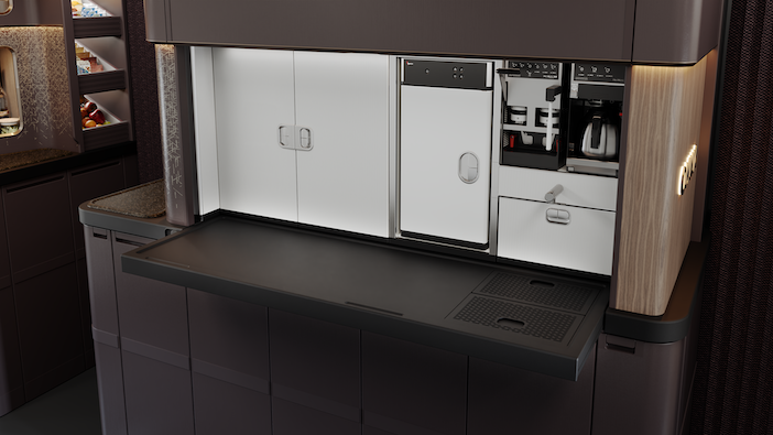 At the centre of Omnia is a galley unit with a highly functional layout that includes ACS UK’s patent-pending adaptive worktop, developed to address demand for increased crew working space in the galley. ACS says the adaptive worktop more than doubles the typical usable work surface for crew while reducing maintenance complexity and enabling greater cleanliness. The worktop is complemented with a simplified upper-door mechanism that replaces the traditional roller blind.