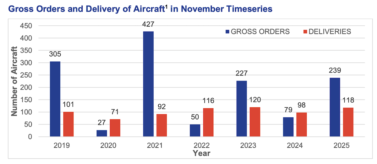 Commercial aircraft orders spiked during November 2025, reaching 239 monthly orders and marking the highest order number for the month of November since 2021. This figure represents a 203% year-on-year increase in aircraft orders for Airbus, Boeing and Comac commercial aircraft, driven largely by the success of the 2025 Dubai Airshow.