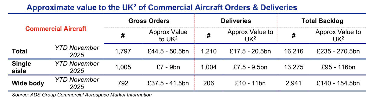 ADS also finds that commercial aircraft manufacturers delivered 118 aircraft in November 2025, which is an increase of 20% compared to November 2024. With the year-to-date delivery figure now standing at 1,210 aircraft, the industry remains on track to achieve ADS’ ‘high growth’ scenario of 1,340 deliveries by the end of 2025.